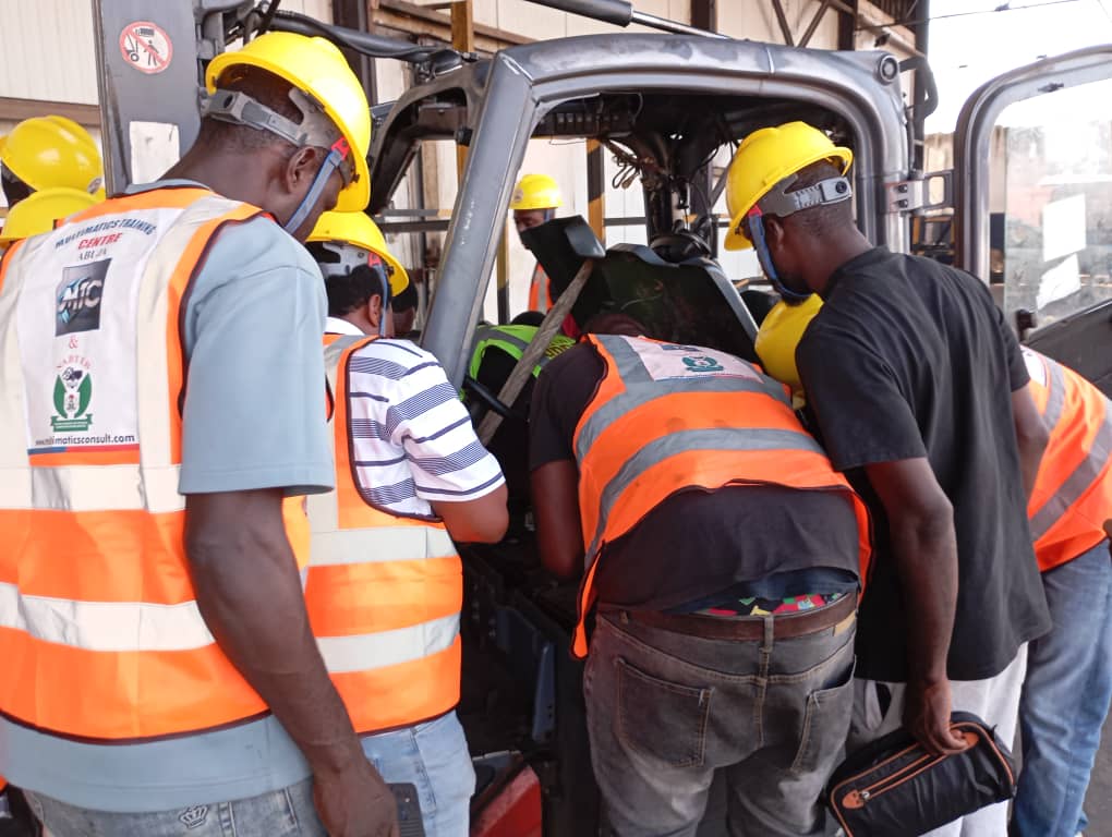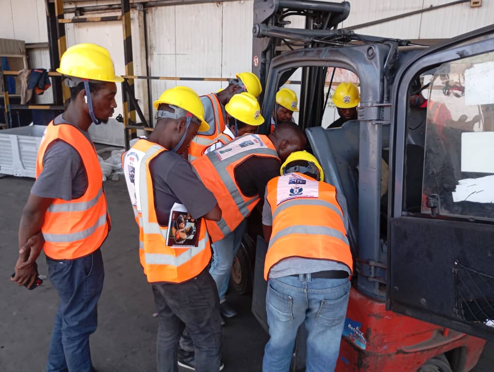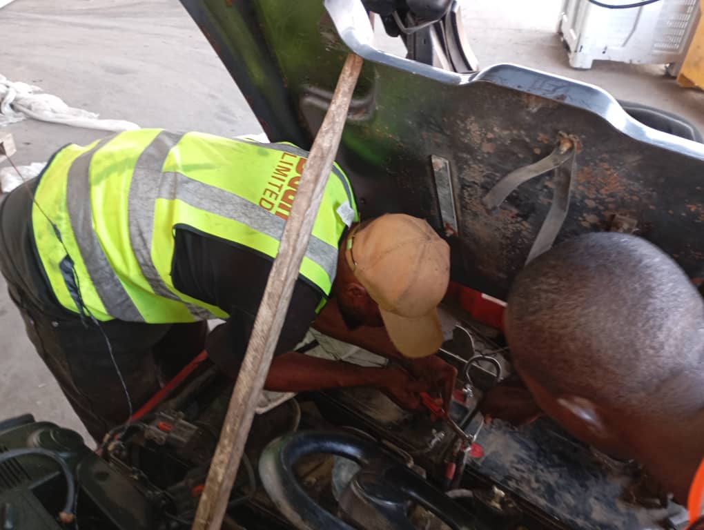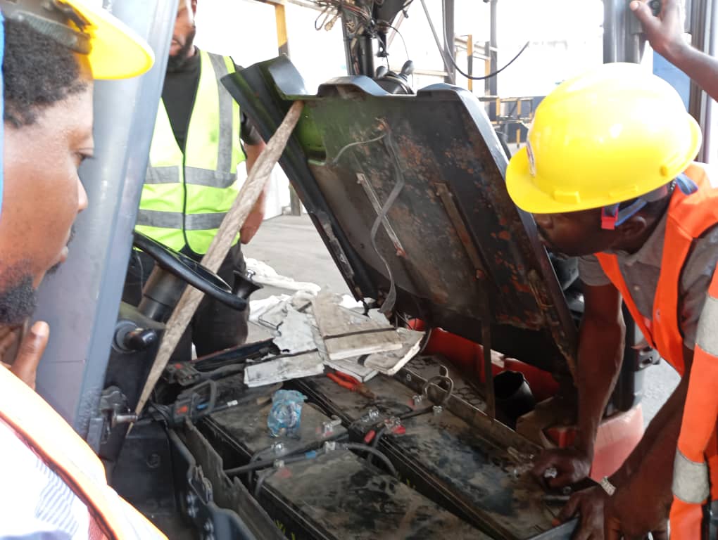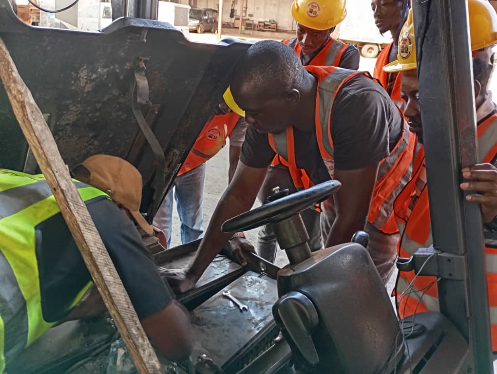 Trainees on stream 2 MTC Benin forklift operators training program, learning troubleshooting on an electric forklift. 27th Nov 2024