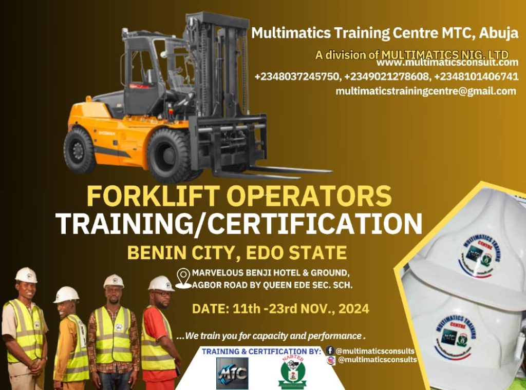 Using the National Business and Technical Examination Board NABTEB approved curriculum for training of Forklift Operators in Nigeria, MTC Abuja is bringing to the doorstep of capable men and women in Edo state who wish to train as professional forklift operator. This training program leads to the award of NABTEB professional modular certificate in forklift operation